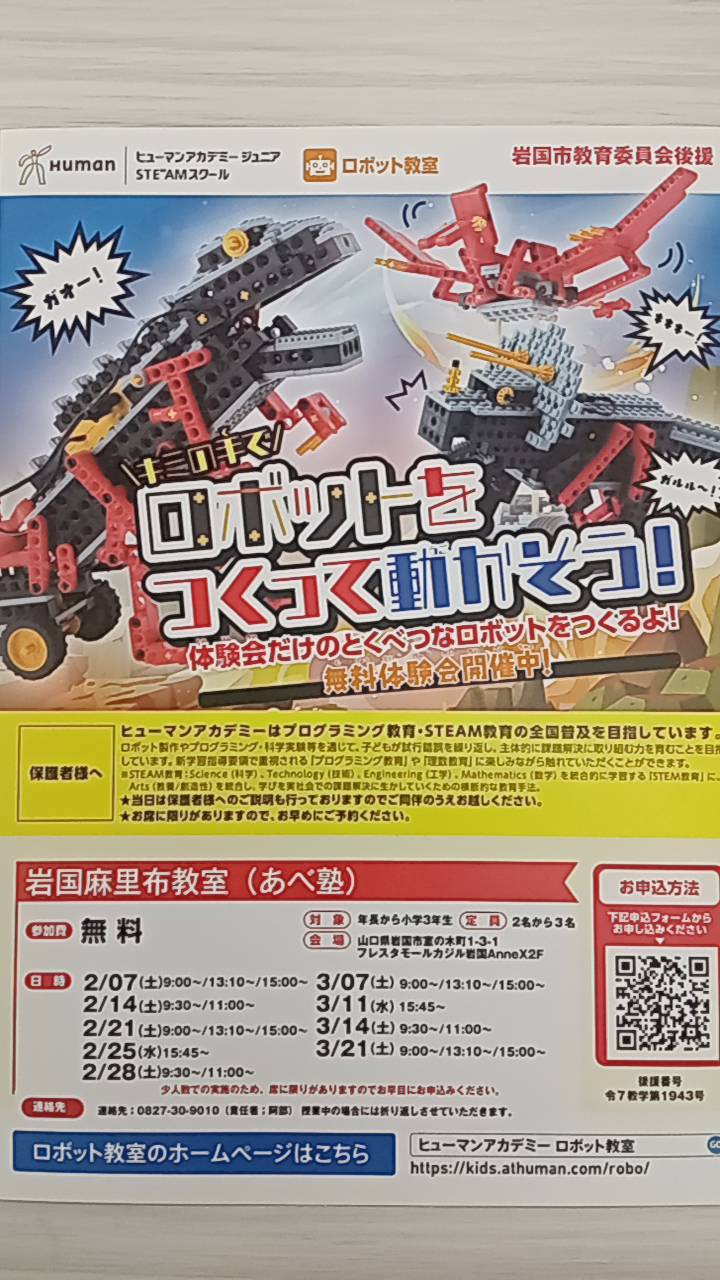 岩国市教育委員会の後援をいただいたロボット教室体験会のチラシをお配りしています。
